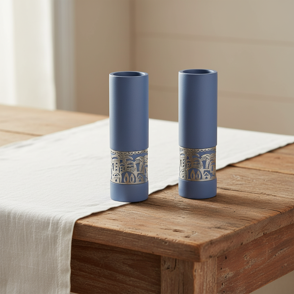 זוג פמוטים בעיצוב נקי, בגוון כחול רגוע. טבעת עיטור בגוון כסוף, בהשראת קווי האדריכלות של ירושלים, מוסיפה נוכחות אלגנטית ומאופקת לשולחן השבת ולחלל הבית.