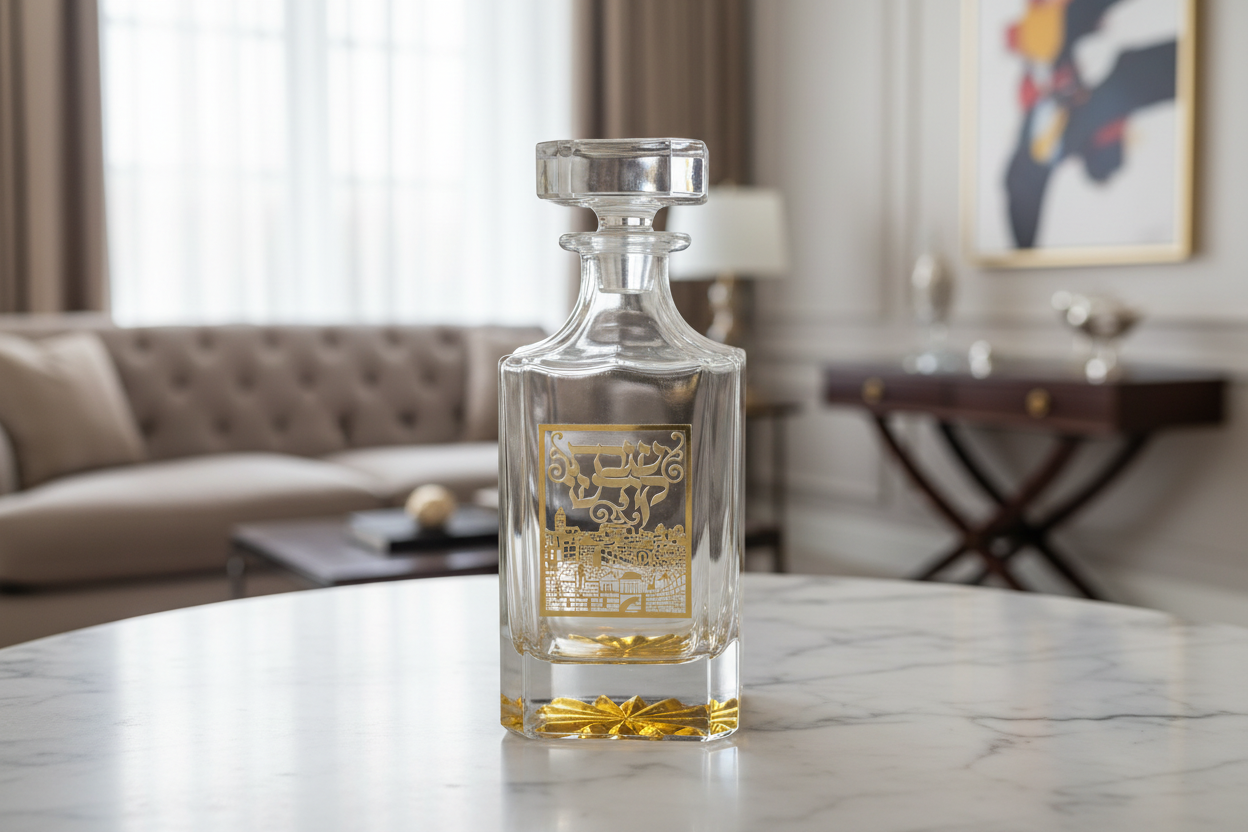 בקבוק יין מקריסטל בעיצוב קלאסי אלגנטי, עם סילואטה מרובעת וחיתוכים מדויקים המדגישים את הצלילות והברק הטבעיים של הקריסטל. עיטור מוזהב של העיר ירושלים במרכז הבקבוק יוצר נוכחות מכובדת על שולחן שבת וחג.