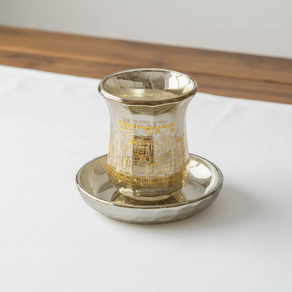 גביע קידוש מקריסטל בעיצוב אלגנטי, עם גוון שקוף זהוב וחריטת "ירושלים" מוזהבת. המבנה המעוגל וללא רגל יוצר תחושת ניקיון צורני ונוכחות מעודנת, המעשירה את מראה שולחן השבת.