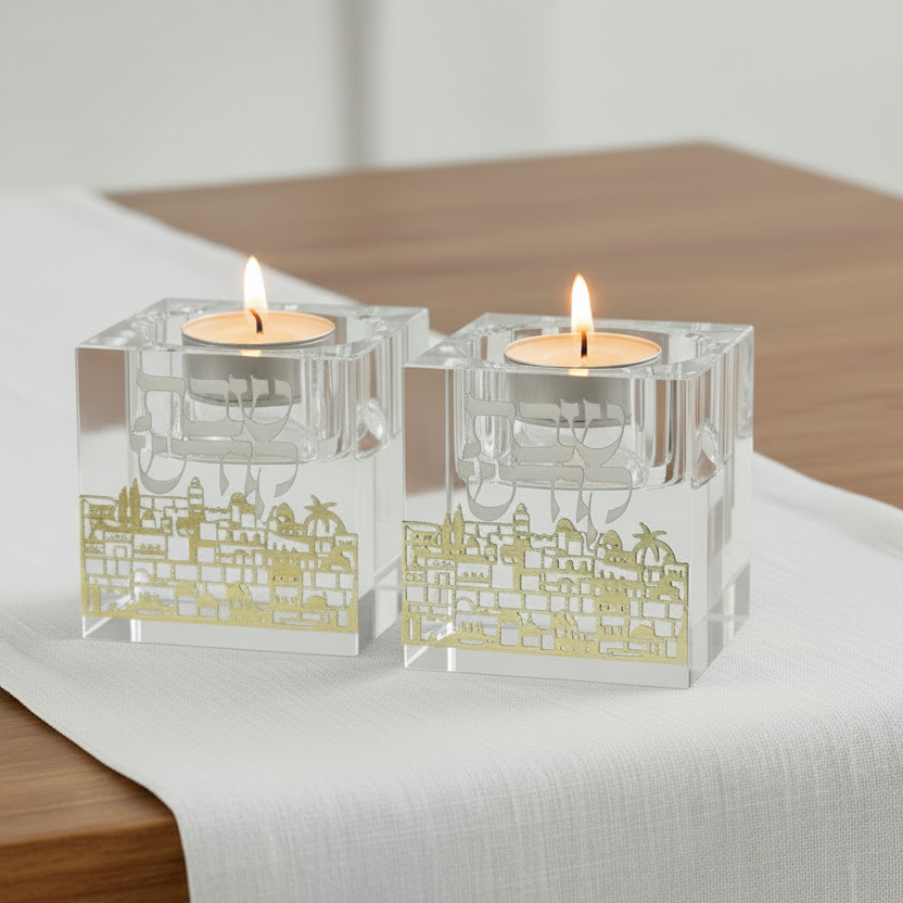 זוג פמוטי קריסטל מרובעים בעיצוב מודרני ונקי, עם שקיפות בהירה וקווים גאומטריים מדויקים. בחזית כל פמוט משולב איור ירושלים עדין בגוון זהוב, היוצר מראה אלגנטי ומאוזן שמוסיף נוכחות מרשימה לשולחן השבת.