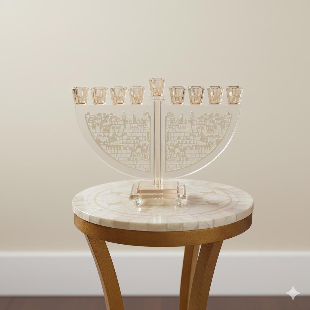 חנוכייה מעוצבת מקריסטל עם בסיס מוזהב ובתוספת איור של העיר ירושלים. השילוב בין הקריסטל השקוף לגוון הזהב יוצר מראה אלגנטי ונקי, עם נוכחות עדינה ומכובדת בחלל הבית.