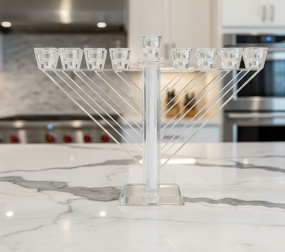 חנוכייה מעוצבת מקריסטל שקוף בעל קווים אלכסוניים נקיים ומראה מהודר. הגימור הבהיר וקווי העיצוב המדויקים יוצרים נוכחות אלגנטית ומתוחכמת, המתאימה לחללים מודרניים וקלאסיים כאחד.