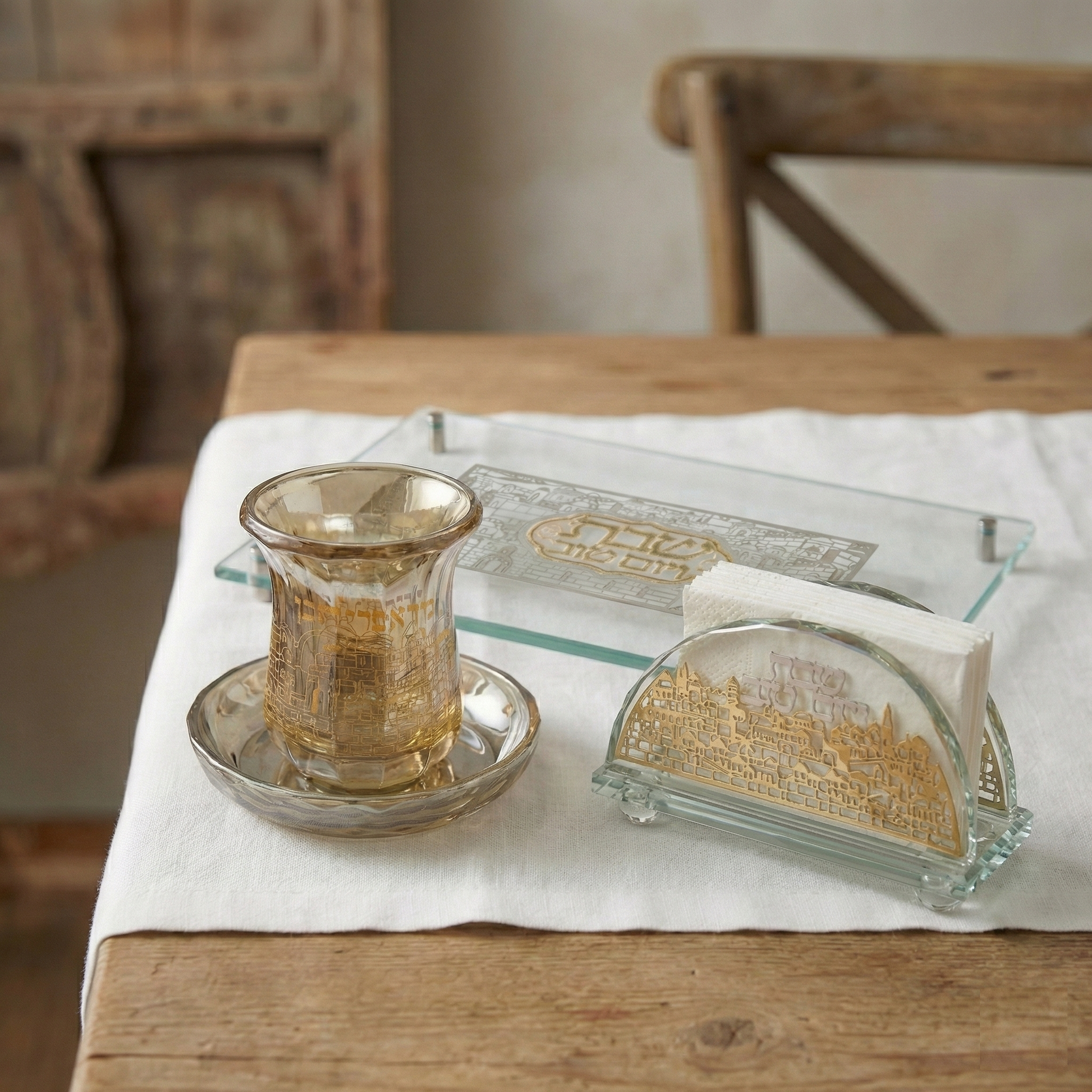 סט שבת קריסטל "ירושלים" בעיצוב יוקרתי המשלב שקיפות נקייה עם עיטורי ירושלים בגווני זהב וכסף. המראה המאופק והגימור המבריק מעניקים לשולחן תחושת חגיגיות ונוכחות מכובדת.