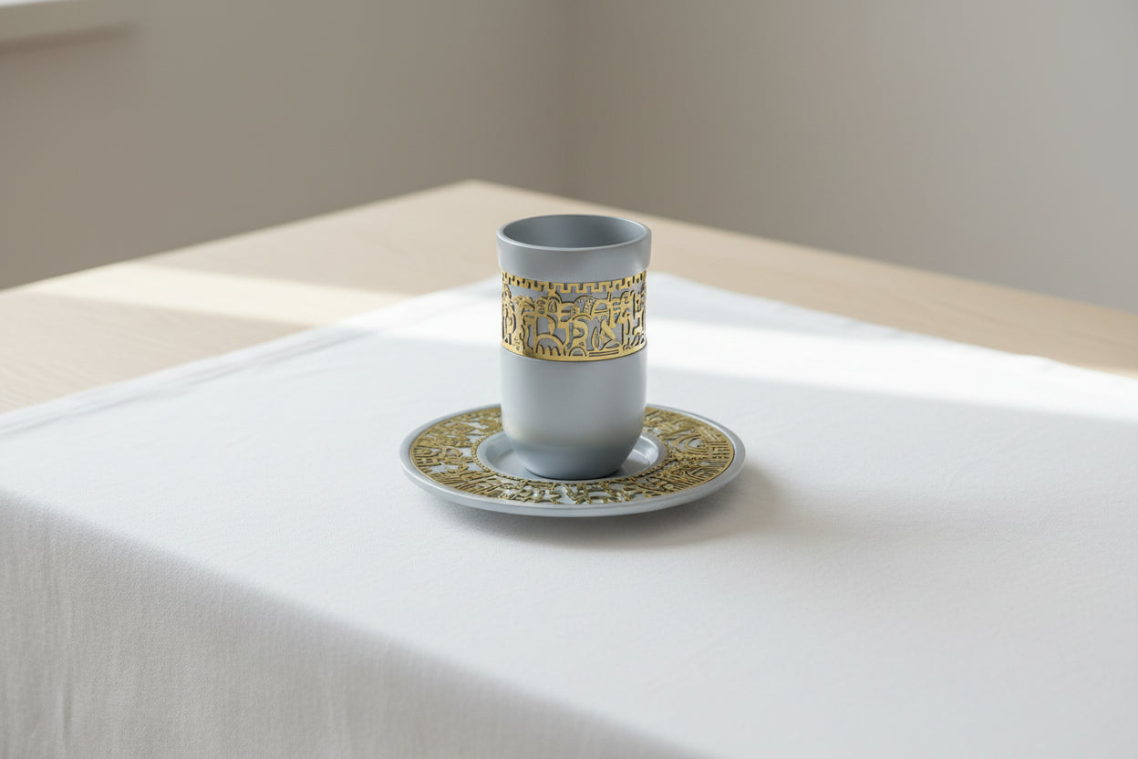 סט כוס קידוש וצלחת תואמת בעיצוב אלגנטי. גוף האלומיניום הכסוף משולב במגזרת נחושת בגוון זהוב, המתפתלת סביב הגביע ומעטרת את הצלחת במוטיב ירושלים. השילוב הדו-גוני יוצר מראה נקי ומאופק עם נוכחות מרשימה על שולחן השבת.